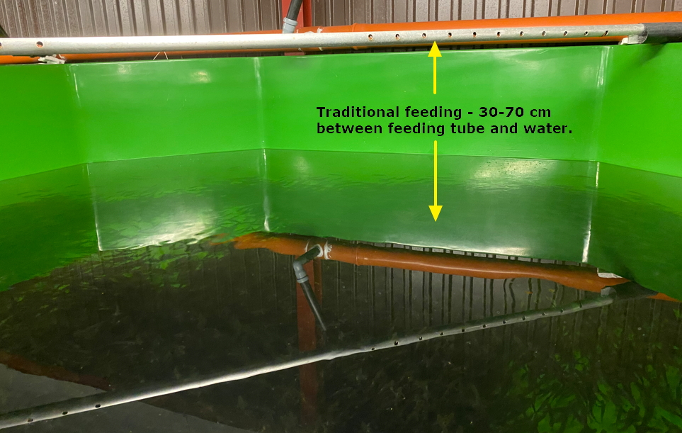 This causes the feed to break the surface and quickly descend to the bottom of the tank. With the current setup, the largest and most aggressive fish that are highest in the water masses secure the best access to feed, while the smaller fish have less access to food.